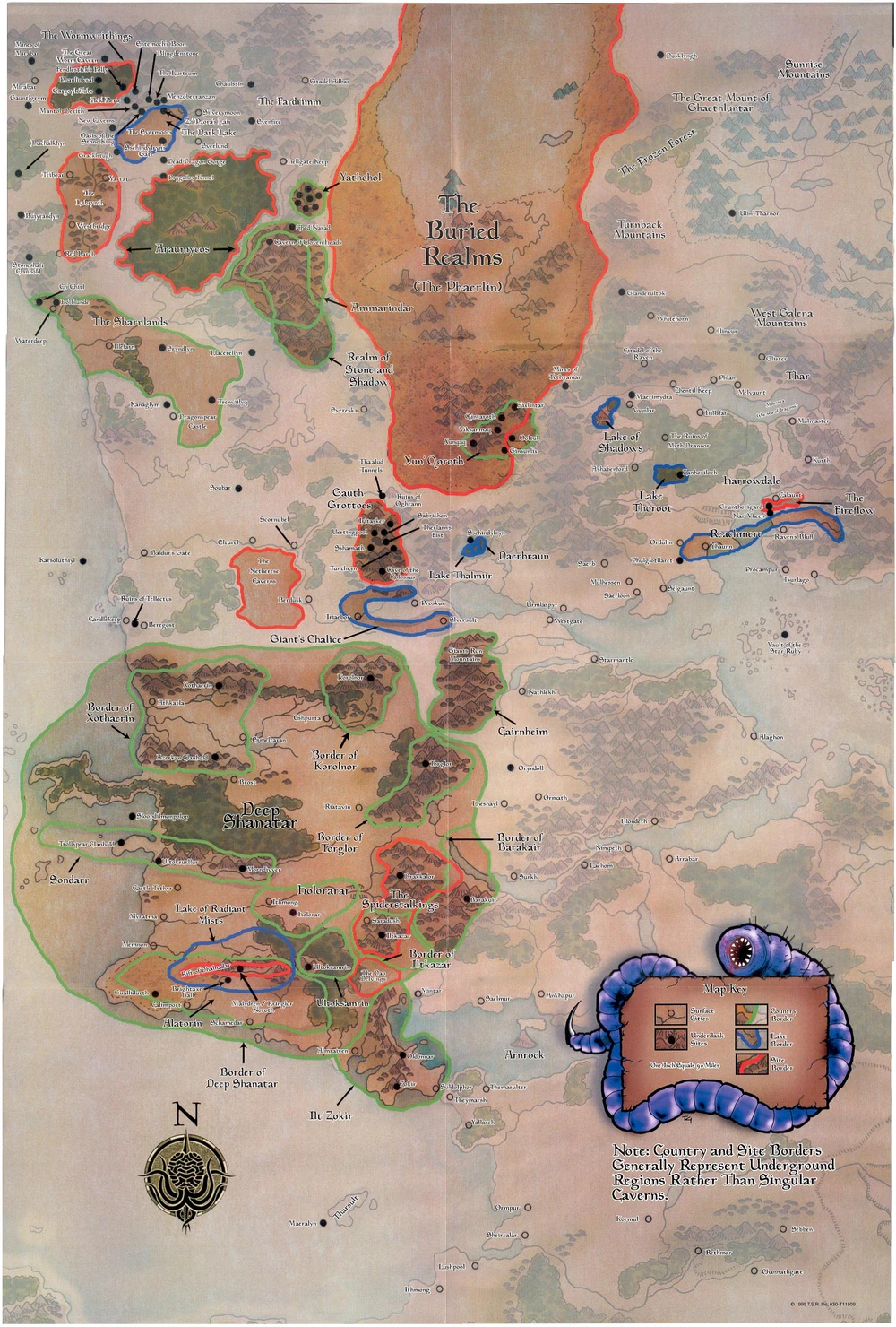 The Underdark is not one giant cavern under Faerûn, but rather many huge networks of caverns and caves. As a result, it is not always possible to travel from one end of the Underdark to the other. The Underdark is divided into several domains that are similar to continents of the world above. While it is possible to travel from one place to another within a domain, separate domains tend to have very few passages linking them. The major domains of the Underdark are the Buried Realms, the Darklands, the Deep Wastes, the Earthroot, the Glimmersea, Great Bhaerynden, the Northdark, and Old Shanatar.